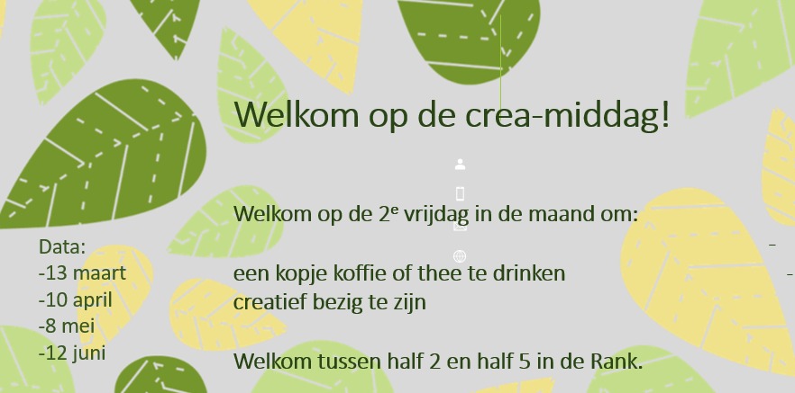 Elke tweede vrijdag van de maand is er Crea club. U kunt kaarten maken, haken, borduren, of wat u wilt. U bent van harte welkom.