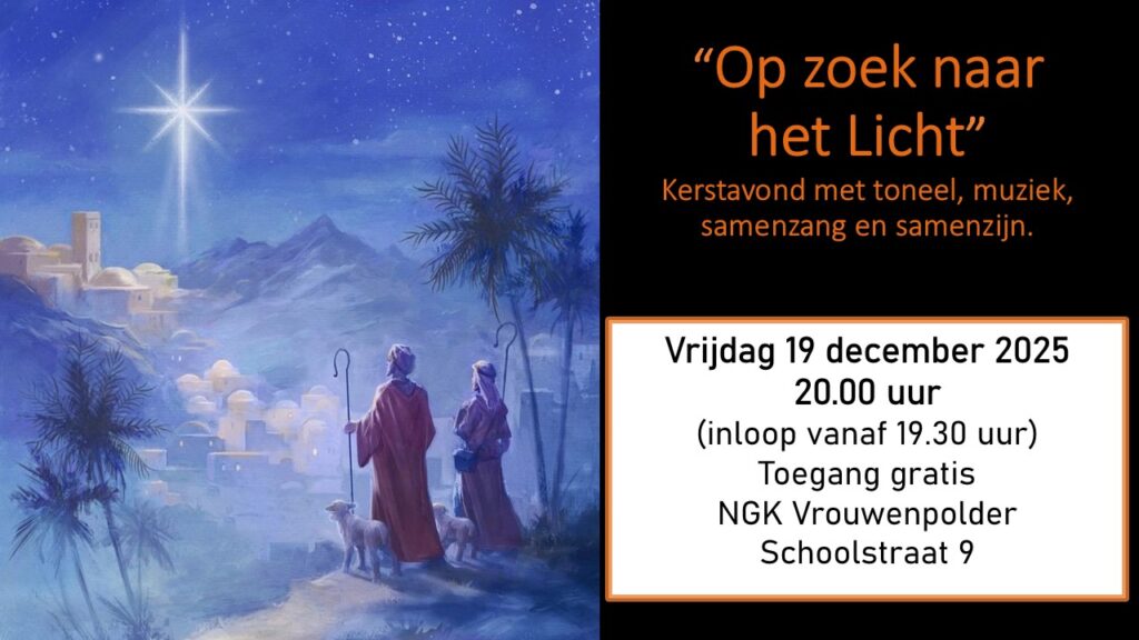 Van harte welkom bij het jaarlijkse kersttoneelstuk. Het toneelstuk is geschreven en geregisseerd door Kees en Nelleke Folmer. Het wordt uitgevoerd door diverse gemeenteleden. Dit wilt u niet missen. 19 december om 20.00. De toegang is gratis.